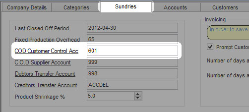 In the Business Setup screen, click on the Sundries tab and then enter a code that will be used for the COD Customer Control Account