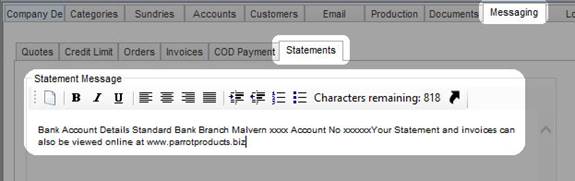 To set the message displayed on statements that will be sent out to customers, click on the Messaging tab in the same Business setup screen.