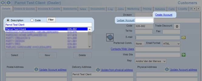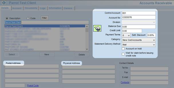 The Postal and Physical details. This is for accounts linked to more than one customer, or if the address differs from the address in the Customer screen, for example if the invoice address is a head office.
