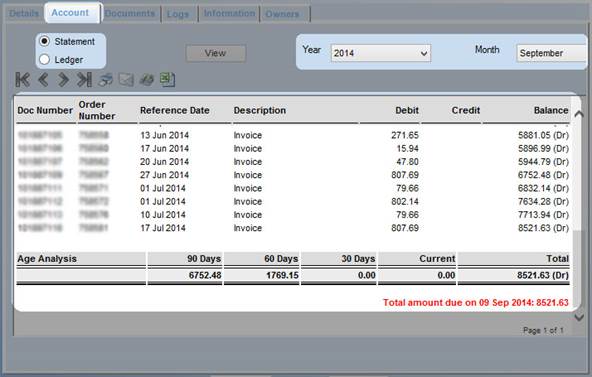 In the Account tab, you can view all the statements that have not yet been paid, along with the total and age analysis for the account. It will also show the amount that is due on the date the report is run.