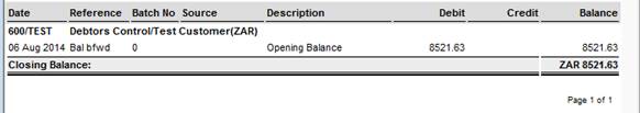 Example of the output for a Ledger showing the Opening Balance: