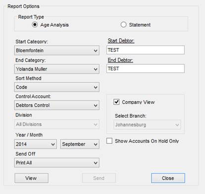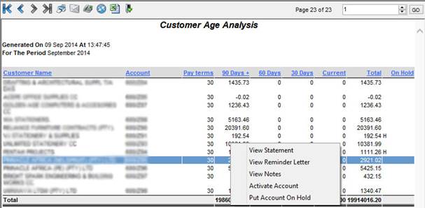 Age Analysis – This will show the account activity / payments due for 30/60/90 days. This option will also have additional information available when Right Clicking on a certain customer, such as viewing the statement, generating a reminder letter and placing the account on hold / removing from hold.