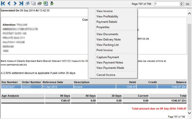 Statement view example, with the right click menu with additional functionality available. The “Bank Account Details Statement…” message displayed on the statement is the message that was set up in the business setup as above.