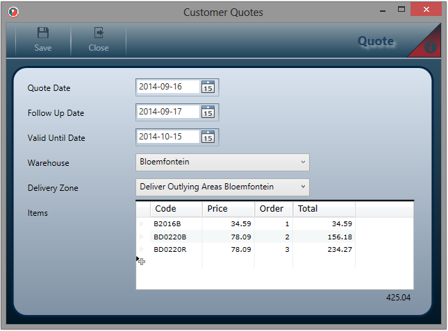 The values are set to defaults, please verify or modify the “Quote”, “Follow Up” and “Valid Until” Dates as well as the Warehouse and Delivery Zone.