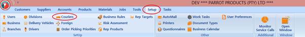 In order for a courier company to have its fees automatically calculated by the Parrot ERP Program, a Supplier representing the courier company must first be created. Once this has been done, the courier company can be linked to a module which will calculate the fees and display the amount on an order/invoice or quote. To view all the current courier companies, click on the Setup tab and then click on Couriers (as shown in the figure below.)