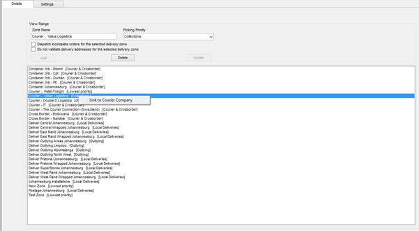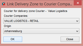 Once the screen has loaded the Delivery Zones, you can right-click on a zone and select Link To Courier Company from the popup menu. You will then have the option to select the courier company and select the origin (starting point) from which the fees will be calculated from.