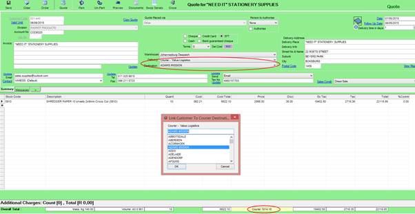 Click OK and then Save your changes. If a Delivery Zone that is linked to a Courier Company is selected on an Order/Quote/Invoice, the appropriate fees for the selected destination will be displayed in addition to the normal cost totals. A sample of this will be shown on the next page: