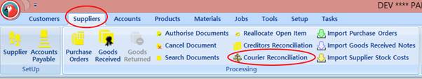 In order to perform a courier reconciliation, a new recon batch will need to be created. In order to do this, click on the Suppliers tab and then click on Courier Reconciliation, as show in the screen below: