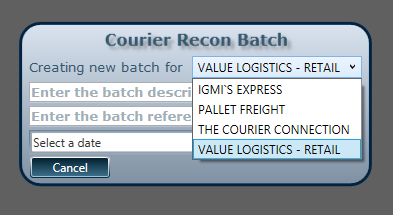 You will then be required to select which courier company the recon batch is for, enter a Description for the batch and enter a batch Reference Number, as well as enter the date of the courier recon.
