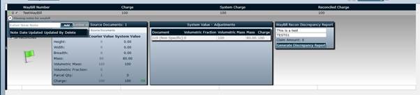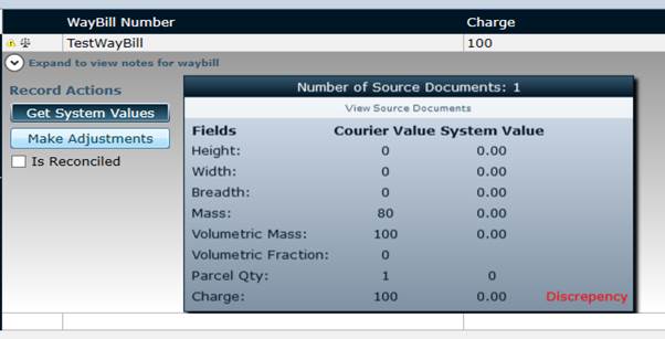 If you click on Make Adjustments you will be able to change the system values for this WayBill Number. Once you are done with any changes, you can check the Is Reconciled checkbox where you will then be required to enter a Description and Reference for the WayBill Recon Discrepancy Report and the total amount that will be claimed will be displayed (if applicable), as shown below: (Note that records with no discrepancy are marked by the Green flag)