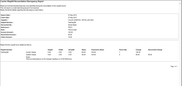 If you click on Generate Discrepancy Report, then click View Report you will be shown a report of any differences between the values from the courier company and values from the system. Note that you cannot view a discrepancy report for a waybill whose values match the system’s. An example report is shown below:
