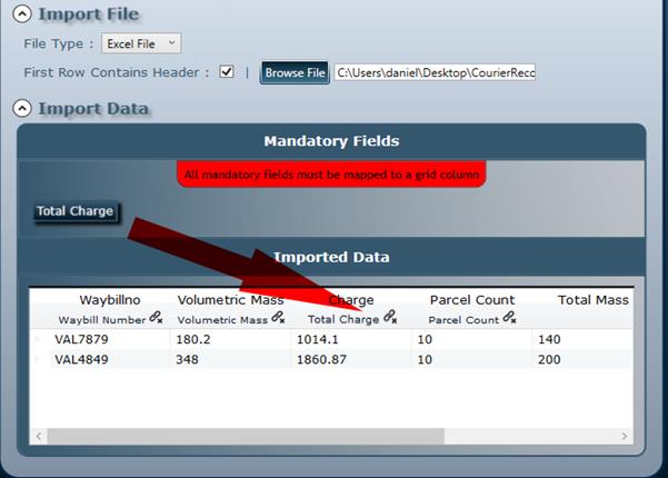 To map a Mandatory Field to a grid column, simply hold the left-mouse button on the field you want to drag and then drag it over the Column Heading in Imported Data you wish to map the field to, as shown below (the dragging is marked by the red arrow):