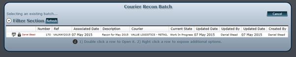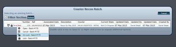 This will display any existing batches. Note that if the batch is Locked to a User (seen in the picture in red letters next to the lock icon), it means that the user is currently busy with editing that specific Recon batch. In order for another user to edit the batch, the user who has locked it must right-click on the record’s row and select Un-lock, as shown below: