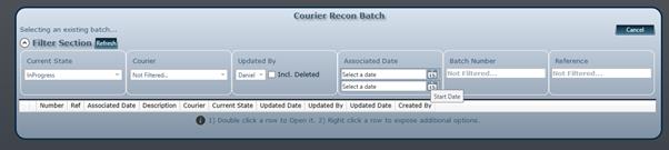 Options for filtering include: Current State (of the batch), Courier (the courier company the batch is for), Updated By (lets you filter by which user updated the batch last), Associated Date, Batch Number and Reference. Once you have selected any filter options, click Refresh to allow the grid to filter to your selected constraints.