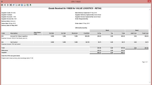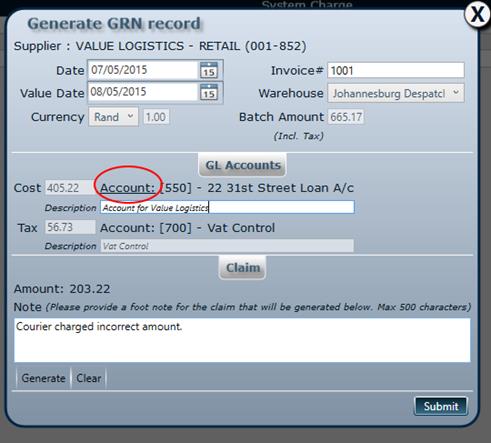 Once you have clicked this you will be presented with the Generate GRN Record screen. You will be required to enter an Invoice Number, a Description, a footnote for the Claim and to select the GL Account for the record by clicking on the underlined Account text (circled in red) as shown below: