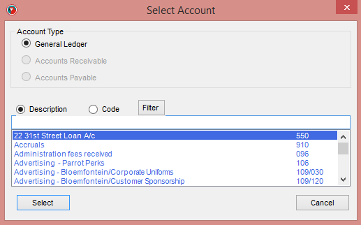 Clicking on Account presents you with a menu where you can select the GL Account.