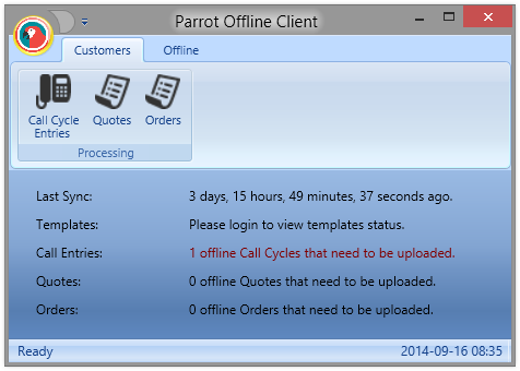 The main window of the Offline App hosts a section with an overview of the status of offline data e.g. last sync date, offline templates status and how many Call Cycles, Quotes or Orders exists offline that need to be uploaded to the server via sync.