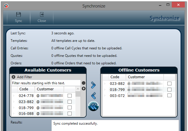 - It also applies (uploads) changes made while in offline mode to the live server e.g. Call Cycles, Quotes and/or Orders created, Customer Contacts added of modified.