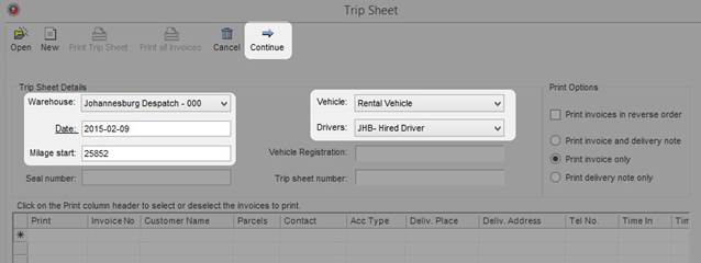 To use trip sheets, click on the Trip Sheet button in the Invoice screen. A screen will open where you can enter the vehicle details and create a new trip sheet, or select an existing trip sheet to add more invoices to.