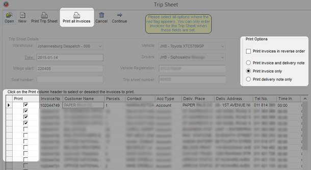 When a trip sheet is selected, the option to not print invoices will be taken into account and allow you to print all the invoices at once from the trip sheet when you are done invoicing.