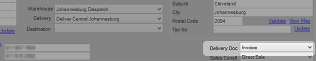 There are two types of delivery documents that can be printed when completing an invoice, Invoice and Delivery Note. The type of delivery document can be selected by changing the Delivery Doc option as shown below.