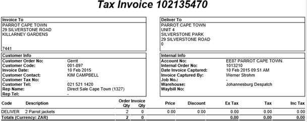 All the products that were added to the Sales Order will also be loaded automatically with the correct quantity ordered. In the example above, the quantity is showing 0 and will have to be changed to 2 (this is the quantity that will be invoiced). If the order that was selected has been picked in the Picking screen, then the quantity picked will automatically be displayed in the quantity to invoice.
