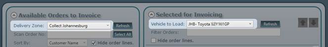 When the Invoice Control screen opens, select a delivery zone to select order from and then select the vehicle that will be loaded. Orders will only be available for selection if the order has been picked or if the order only have service items.