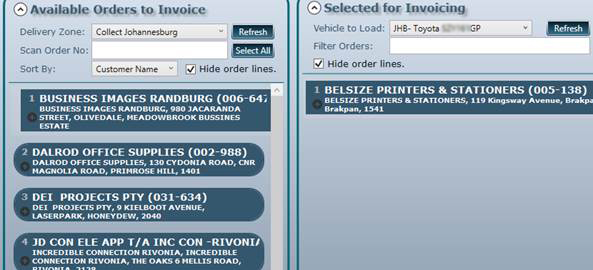 When a Delivery Zone is selected, all available orders that can be invoiced will be loaded. To select an order for invoicing, either drag the order from the left to the right or scan the order number in the Scan Order No textbox.