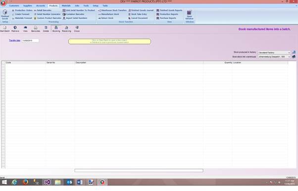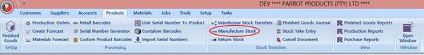 To access the Manufacture Stock Page, click on the Products tab and then click Manufacture Stock, (under the Stock Transfers section on the ribbon toolbar) as shown below: