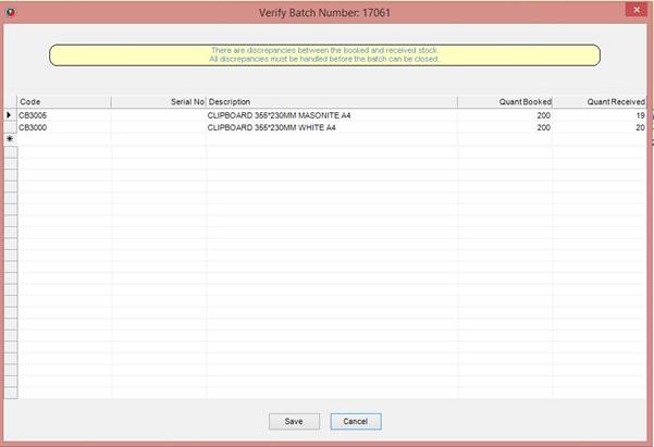 Please note that you will NOT be able to finalise the batch if any items that require serial numbers have not been linked to a valid Serial Number.
