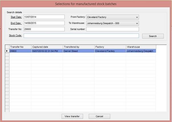 - From Factory: Select the factory the transfer was from that you wish to search for.