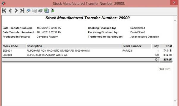 Once you are done specifying your parameters, click Search and any transfers that match your criteria will be shown in the grid. If you select a result and click View transfer you will be presented with the following report, showing the items on the selected batch: