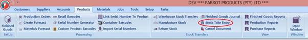 To access the Stock Take Entry page, click on the Products tab and then click on Stock Take Entry (under the Stock Transfers section on the ribbon toolbar), as shown below: