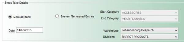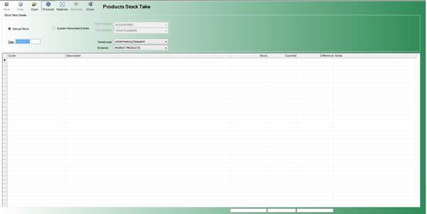 - Products: Selecting this button signals that you are taking a stock take for Finished Goods (Products) and changes the Warehouses and Categories appropriately.