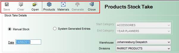 - Clear: Clears the Stock Take grid of all stock items.