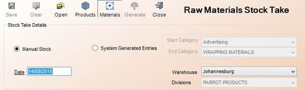 - Materials: Selecting this button signals that you are taking a stock take for Raw Materials and changes the Warehouses and Categories appropriately. (Sample of how the form changes below) :