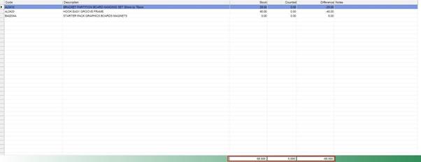 Now you can enter the actual counted amount for each item compared to the system stock in the Counted column. The Difference column will reflect any discrepancies between the Stock and Counted items. You can add a Note for a stock item if necessary by clicking on the column and entering the text. Circled in red at the bottom of the grid are the total count for Stock, Counted and the total Difference for all stock items in the grid. Once you are done with the Stock Take, clicking Save will save it to the system.