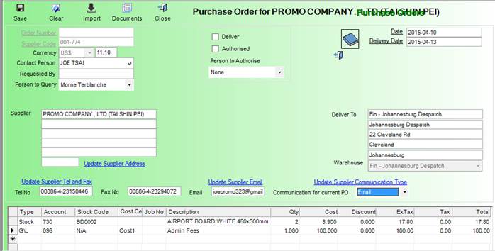 Supplier, Tel, Fax, Email – Display Supplier details.