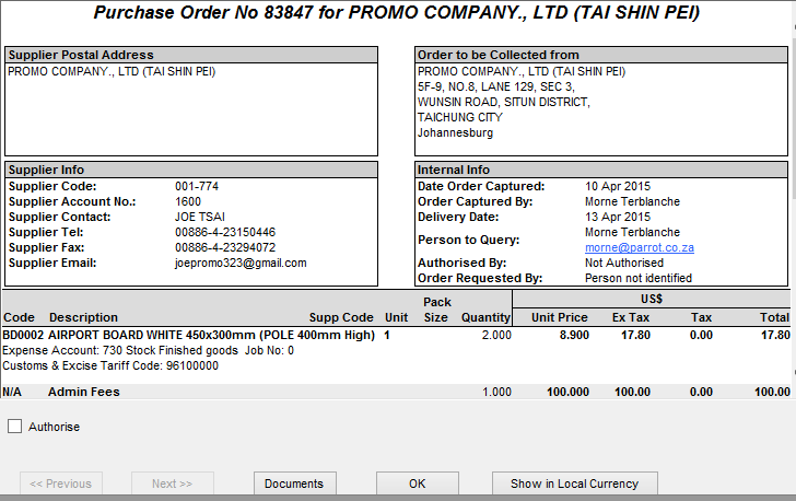 Person to Authorise – The person with permission to authorise Purchase Orders.