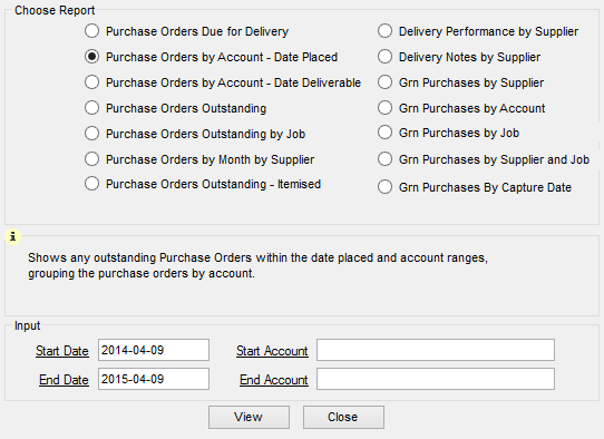 PO by account – Date Placed – Lists Outstanding Purchase Orders, grouped and summarised by account.