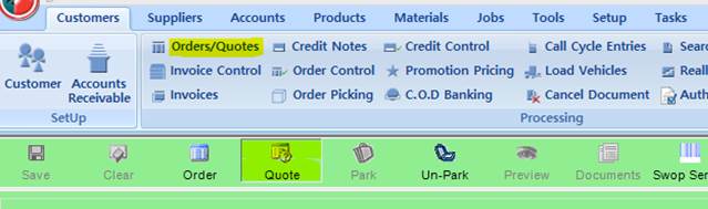 The Sales Quote screen is used to capture quotations on the system for a selected customer. To access the Sales Quote screen, click on the Order/Quotes menu in the Customers tab as highlighted below.