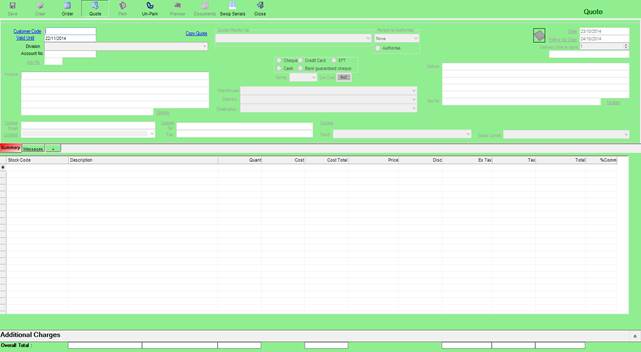 To create a new quotation for a Customer, simply open the “Orders/ Quotes” screen, switch to “Quotes” and enter a valid Customer Code.