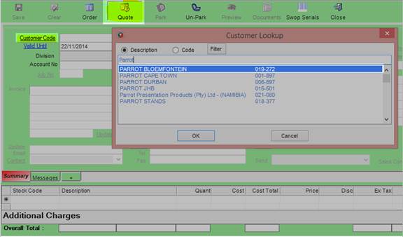 The Customer Code link can also be clicked to launch a look-up from which the user can select the Customer to create a quotation for.