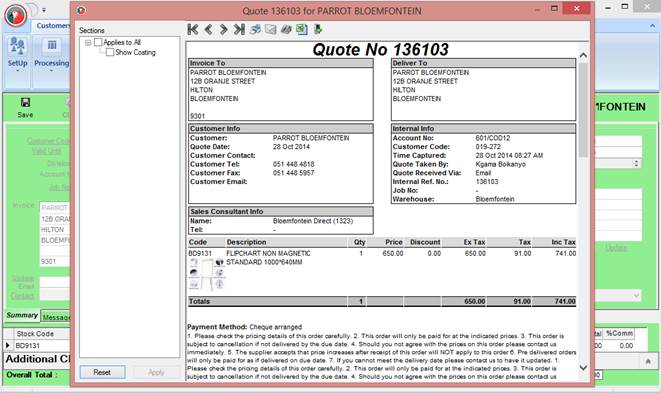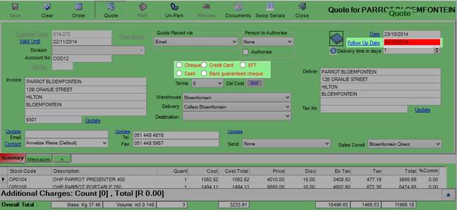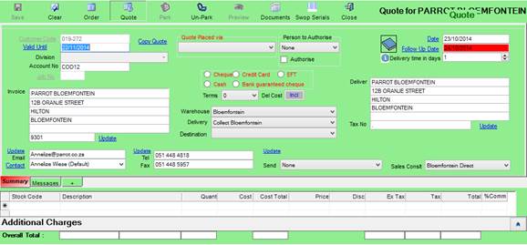 Park / Un-Park – This will save the quotation temporarily if the user wishes to continue working on it at a later stage. The parked Quotation will be available until the user saves it as a formal customer quote.