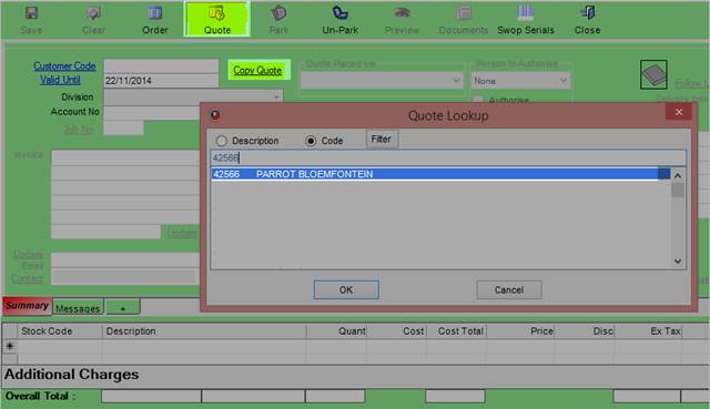 On the quotations screen, click on the “Copy Quote” link and a look-up will be opened as depicted below. The quotation can be found by looking for the Customer Name (when the Description option is selected) or by the Quotation Number (when the “Code” option is selected).