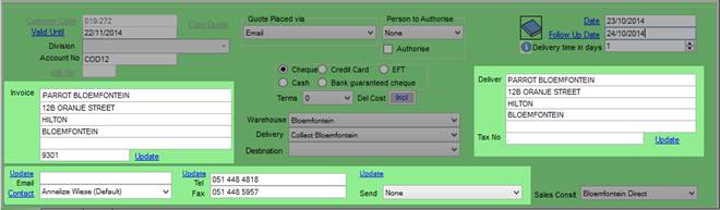 he Invoice and Delivery address will be the default address added in the Customer screen. The user is able to change these addresses specifically for this quotation. If the address must be applied to the Customer as a whole then the “Update” must be clicked. This will update the Customer’s default Invoice and Delivery addresses.