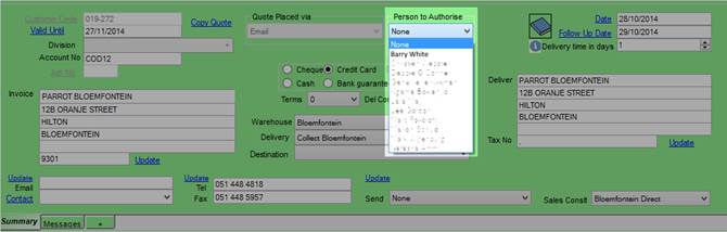 Parrot ERP System allows the quotations to be authorised before they can be sent to the Customer via email or fax when the quotation is saved. The person to authorise the quotation can be selected from the drop down list. Once the quotation is saved, an email will be sent to the selected person.
