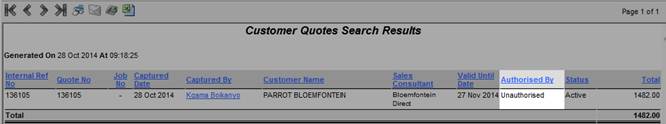 When the quotation is listed for the Customer’s quotations, the “Authorised By” property will display the text “Unauthorised” to indicate that the quotation is not authorised.