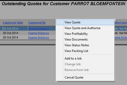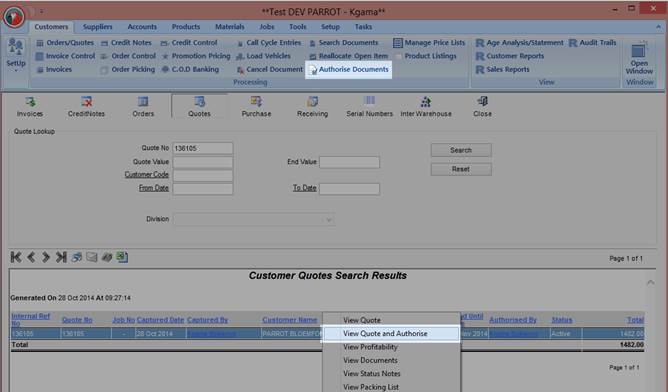 Locate the quotation and right click on it. The Quotations menu will appear and an option to “View Quote and Authorise” will be available.