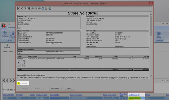 Once the Quote the authorisation screen is opened, the click on the “Authorise” box and click on “Done” to commit the changes made. The quotation will be sent to the Customer by email or fax if it was saved to do so.